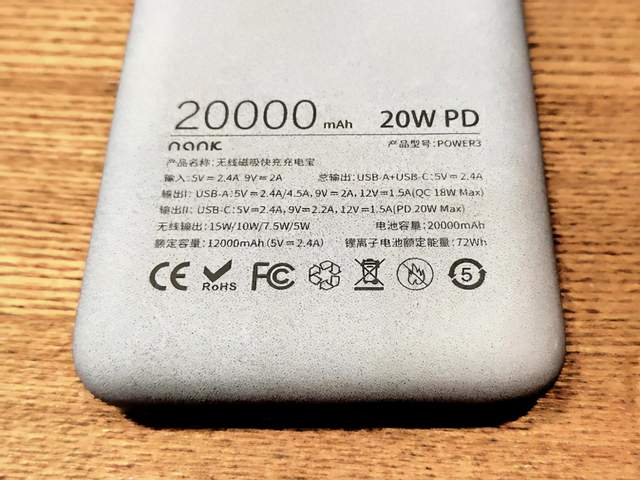 而在南卡无线充电宝POW3背面底部的位置上,清晰印刷有无线充电宝的各项厂牌信息、详细参数,依旧符合各种安全标准的相关认证。尤其是硕大的“20000”mAh字样,更加便于用户日常民航差旅的安检。除此之外,“20W PD”字样,更是意味着这款充电宝能在有线充电的基础上,带来最高20W PD快充协议的功能输出,能满足主流iPhone、平板、Switch等数码产品快充使用。