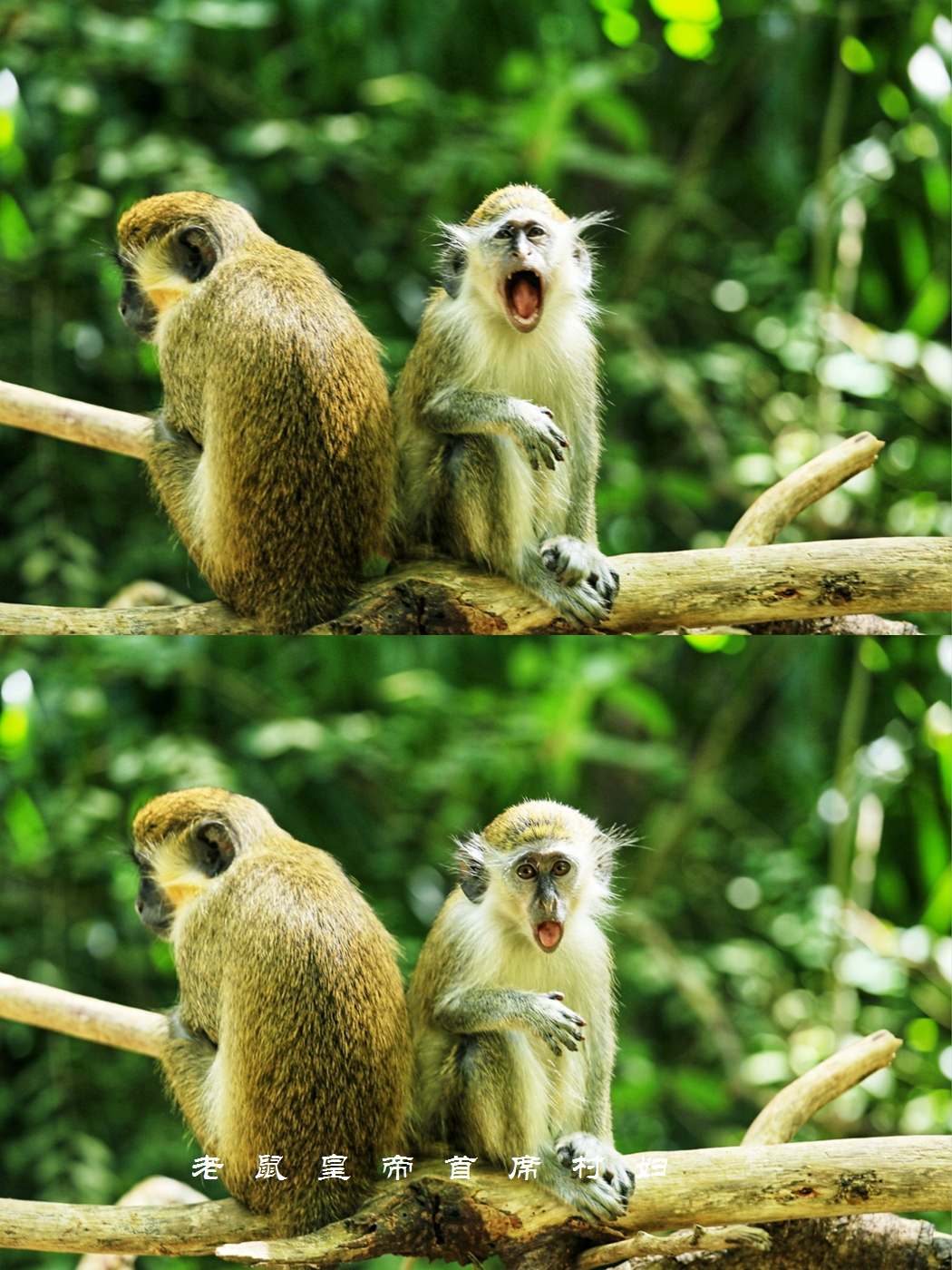 绿猴非常聪明,平时群员之间常用抬眉、眯眼、撅嘴等方式交流情感,令人震惊的是,它们除了会用肢体语言进行沟通,甚至还能说话!