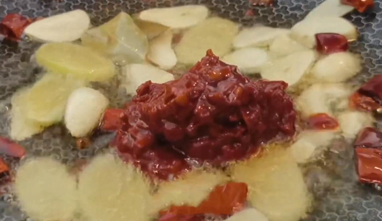 2、起锅,锅中倒入适量食用油,油热后下入切好的蒜片、姜片、干辣椒段、一小把花椒、两片香叶,开小火不断翻炒爆出香味,炒出香味后下入一勺郫县豆瓣酱,继续开小火不断翻炒出红油;