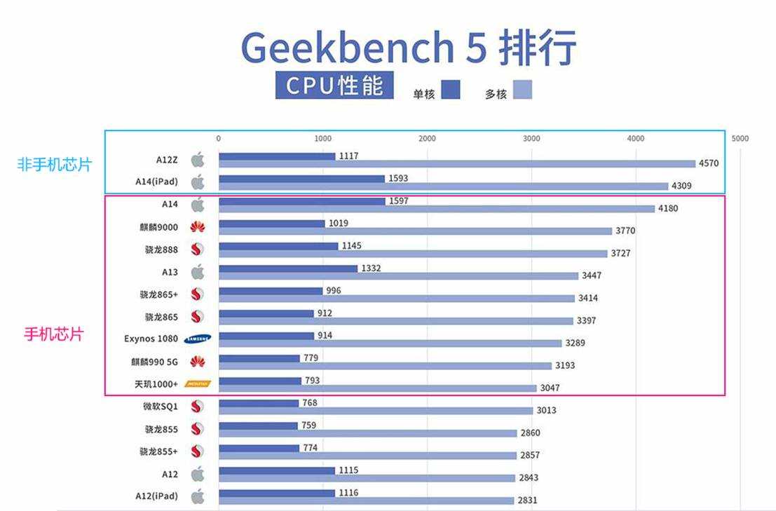 当然,多窗口浏览和多任务并行都需要强劲的CPU性能支持。华为MateX2搭载了旗舰芯片麒麟9000,这款芯片不仅综合性能领先骁龙888位于安卓首位,CPU多核性能更是具有绝对优势。Geekbench5中,麒麟9000多核跑分3770,领先骁龙888高达43分。