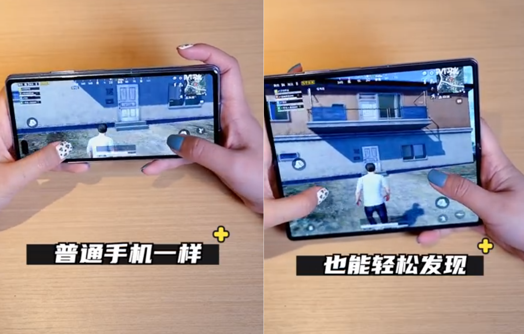 相比于单纯的“大”屏手机,折叠手机绝对堪比物理外挂。普通手机吃鸡时,只能看到一层楼高的视野,在大屏状态下视野直接纵向提升了两倍,角色站在同样的位置却能够看到二楼的场景。不管是远狙敌人还是躲避攻击,都在视野上占据了不败之地。