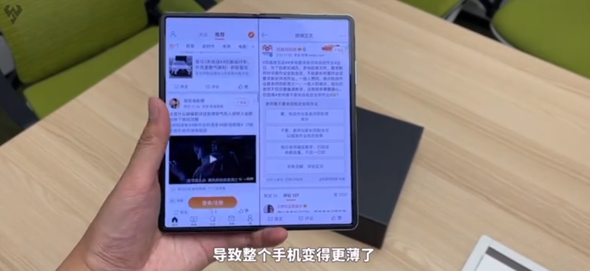 华为Mate X2的内屏采用了7:8:1设计,展开之后相当于两块手机屏幕无缝衔接,在浏览微博时,可以同时观看上下两级页面,相当于多了一块外接屏幕。如此一来,吃瓜爱好者们可以获得双倍快乐了。