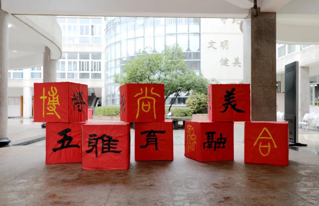 走到一楼走廊, “博雅尚美、五育融合”八个正方体字块,各个平面都融合楷书、隶书、篆书、行楷书法,彰显了美院附小的育人理念和新学期新目标。