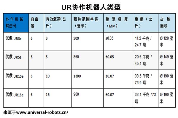 作为协作工业机器人或“协作机器臂”, 优傲 URe型号协作机械臂 ,包括URe3、URe5、URe10、URe16等机械手臂都旨在以安全有效的方式与人类共享其工作场所。这使其通过内部布线,刚性,工业级设计和新开发的组件成为适用于各个行业的有用解决方案。它使用“视觉编程”(基本上涉及触摸平板电脑屏幕进行编程)和“直接示教”(直接示教),这意味着物理移动机器人手臂以记住其位置。