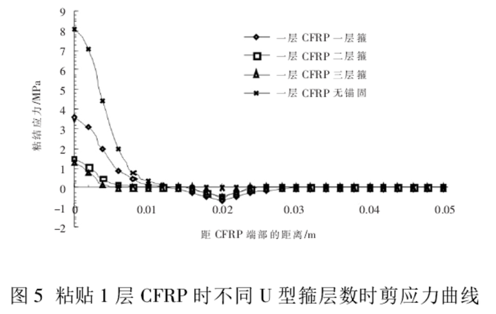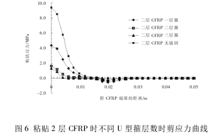 图5、图6分别为粘贴1层、2层CFRP时不同U型箍层数时界面剪应力曲线,可以得出随着U形箍缠绕层数的增加,端部锚固区域界面间的粘结应力明显降低,并且随着U形箍锚固层数的增加,CFRP端部剪应力越小,CFRP端部过早发生失效的概率越小,在一定的范围内,U形箍层数越多,CFRP端部锚固程度越强,锚固的效果越理想,但U形箍的锚固层数最多不宜超过3层。