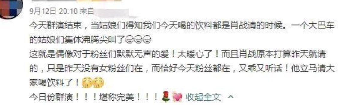 拍摄《王牌部队》时,有群演透露肖战请群演喝饮料了。肖战并没有大张旗鼓的说自己请客,而是默默付款,啥也没说。群演之所以知道,是因为被剧组的人告知的。