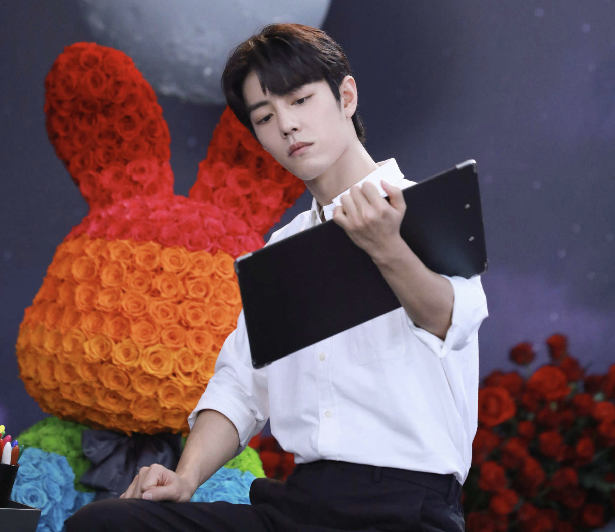 之前与合作的品牌进行直播,有一个环节是肖战填色画画。主持人拿了一桶五颜六色的画笔,原定的是肖战用一根拿一根,剩余的主持人拿着,但肖战一次性拿了很多支。