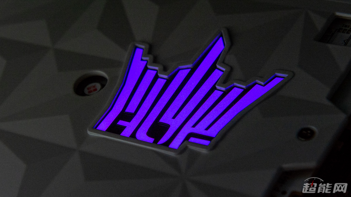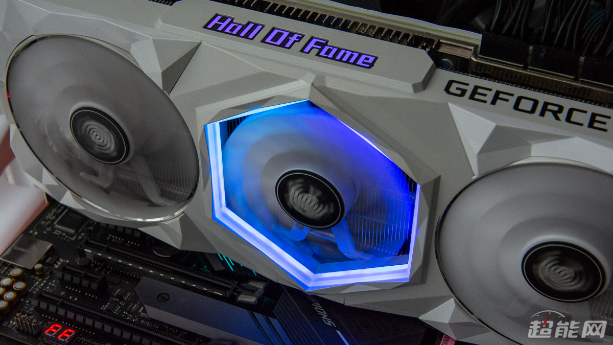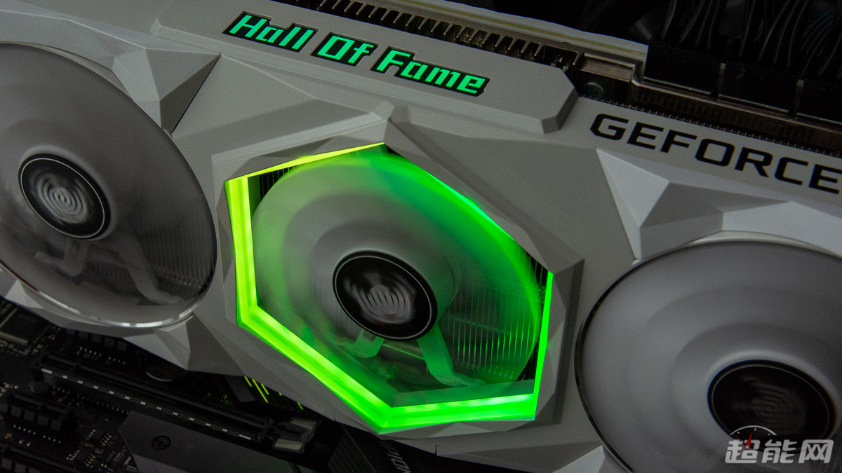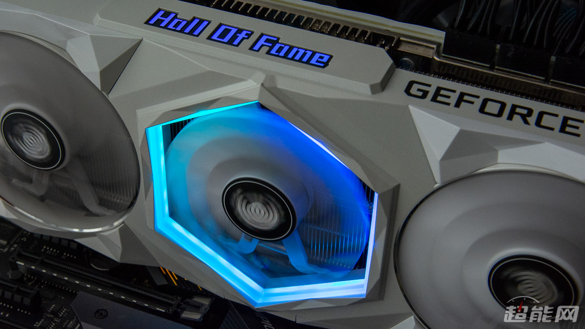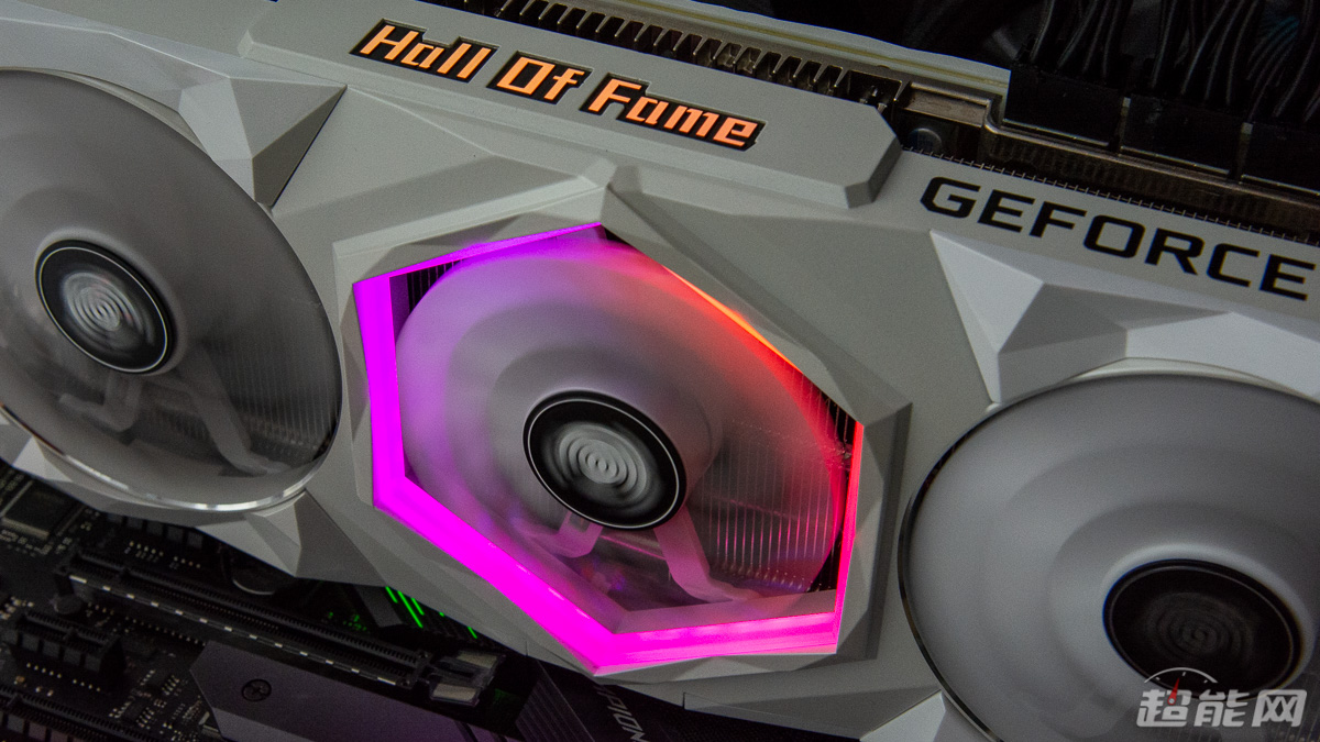显卡的顶部右侧有“GEFORCE RTX”的标识,中间则是名人堂的英文标志“Hall Of Fame”,同时这个标志还带有ARGB灯,可通过HOF AI Suite与Aurora Sync Pro软件实现灯效控制。