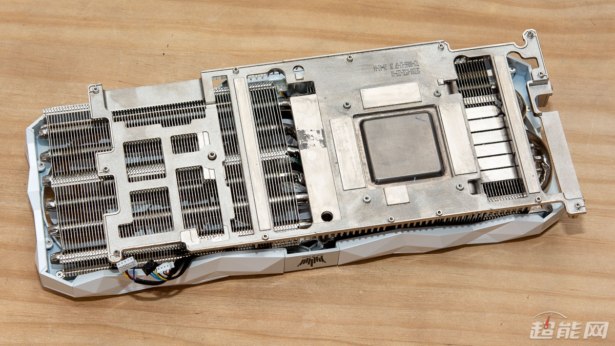 影驰RTX 3090 HOF Extreme限量版显卡使用的是自行设计的白色幻象散热器,采用三风扇设计,底座为VC均热板,配置有6条8mm直径的镀镍纯铜热管,金属中框不仅可以起到保护PCB的作用,也同时可以兼顾显存和供电MosFET等发热部位的散热。