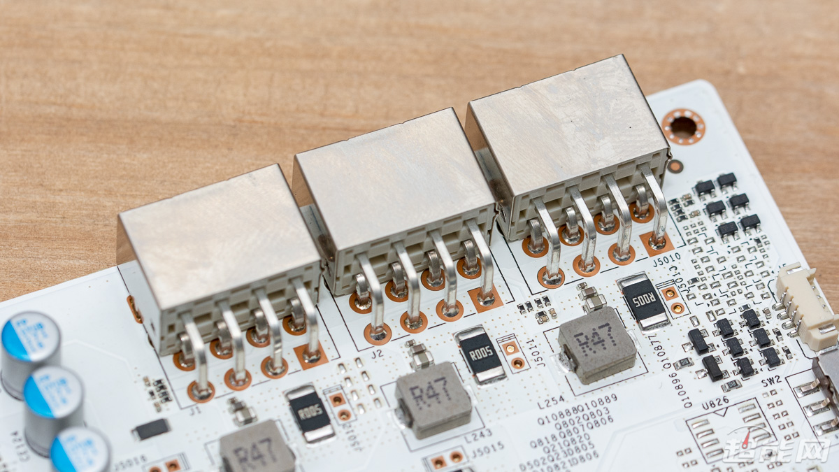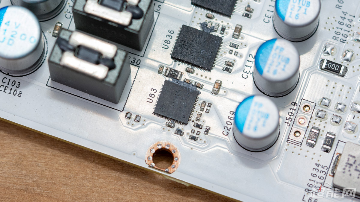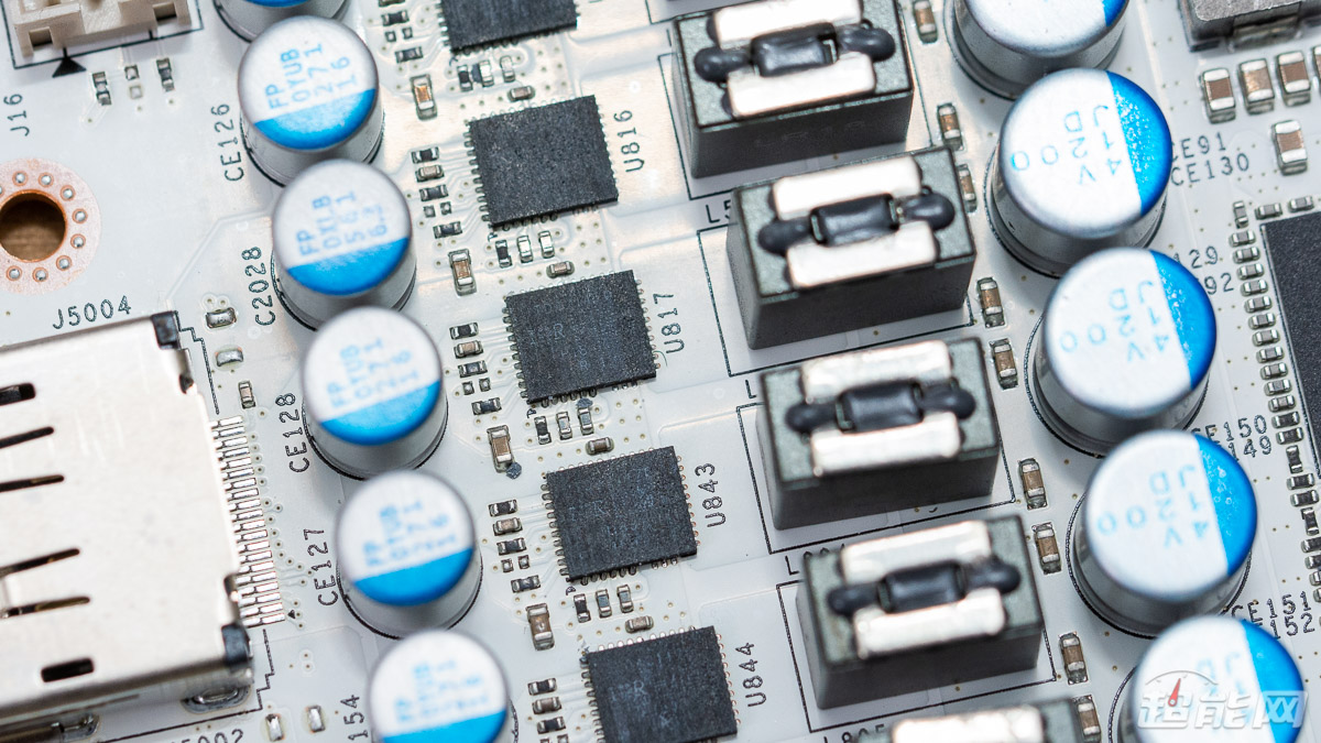 GPU左侧则有2相显存供电与10相核心供电,用料与GPU右侧的供电电路相同,同样是DrMOS、固态电容以及铁素体电感。