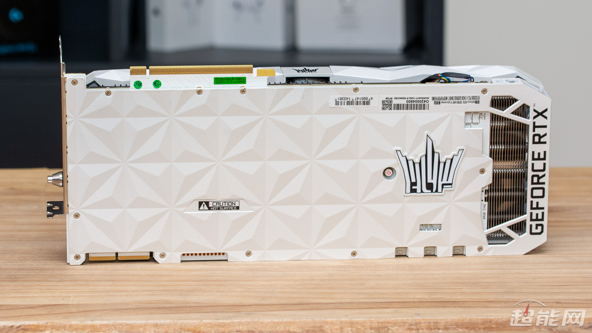 对于RTX 3090级别的显卡来说,背部的金属背板基本上都是标准配置,影驰RTX 3090 HOF Extreme限量版显卡自然不会例外,而且让人印象深刻的是,显卡背面配置有金属背板不仅采用了与HOF主题色相匹配的白色,而且还做了凹凸有致的菱形立体花纹,使得背板看上去更具层次感。同时背板的右侧有一个镂空区域,可加强散热风流的穿透效果,以达到强化散热的作用。
