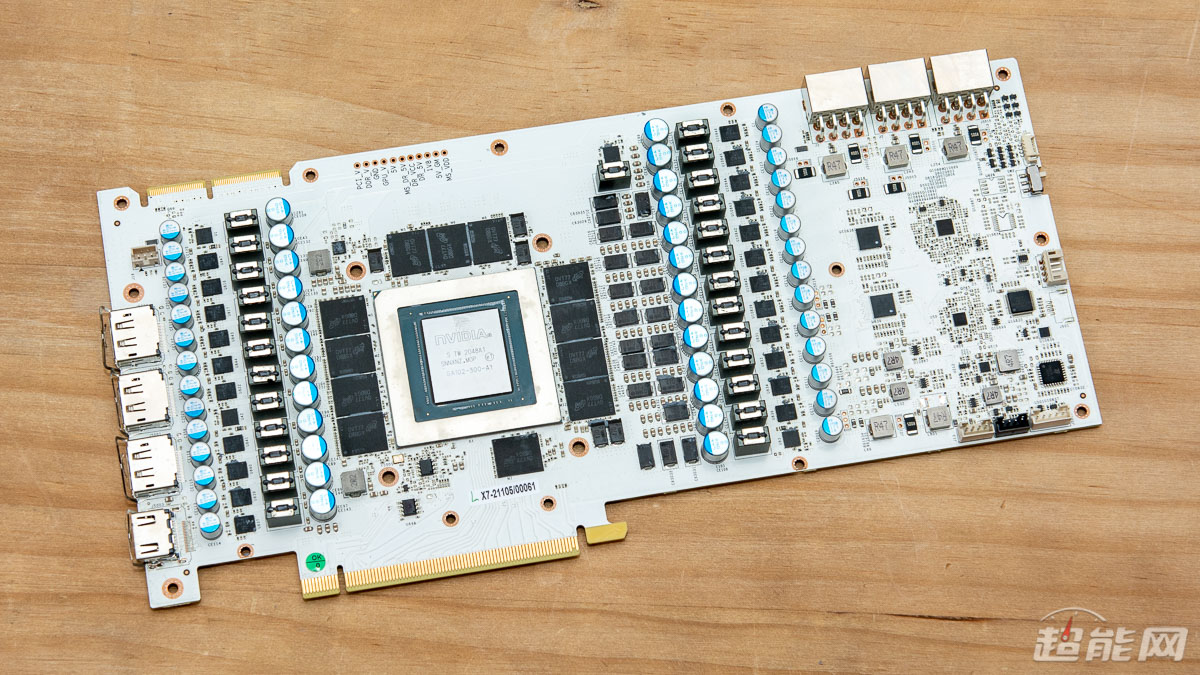 虽然影驰RTX 3090 HOF Extreme限量版显卡是一款面向发烧级玩家的旗舰级产品,但是其结构并不算复杂,基本上就是散热器、PCB本体以及金属背板三个部分,可以看到其散热器要比PCB更长,这样的设计一来可以提供足够的散热面积,二来配合背板的镂空设计也可以进一步提升显卡的散热效能。