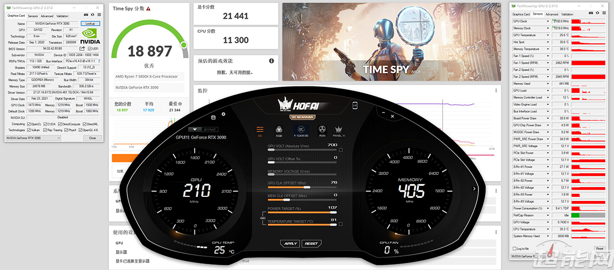 影驰RTX 3090 HOF系列显卡目前有三款产品,按照频率从高到低分别为RTX 3090 HOF OC LAB、RTX 3090 HOF Extreme限量版以及RTX 3090 HOF Extreme,其中RTX 3090 HOF OC LAB默认提供高达1905MHz的核心Boost频率,是业内默认Boost频率设定最高的风冷显卡,而且前后共计刷新16项世界超频记录,也是世界首款核心频率超超频至3GHz的RTX 3090显卡,由此可见影驰影驰RTX 3090 HOF系列显卡本身就拥有非常优秀的血统,有足够的实力竞争“最强RTX 3090”的位置。