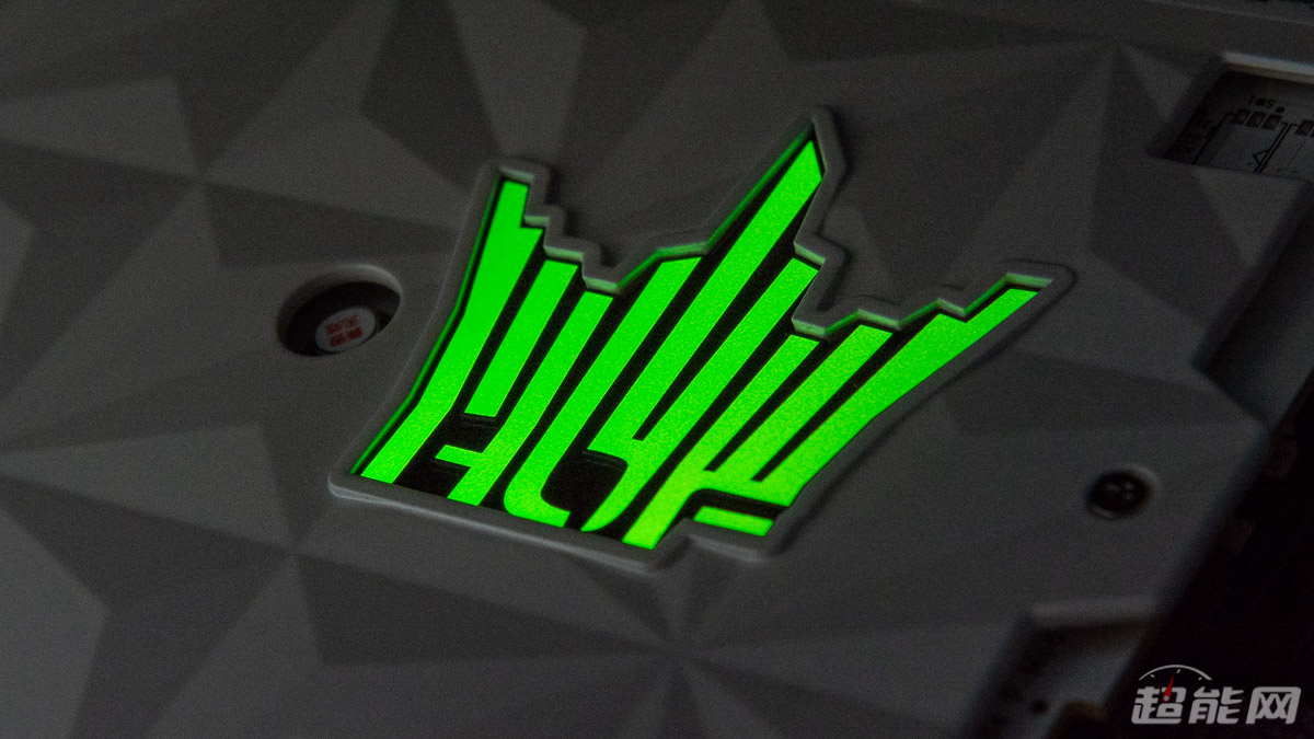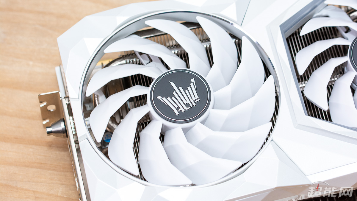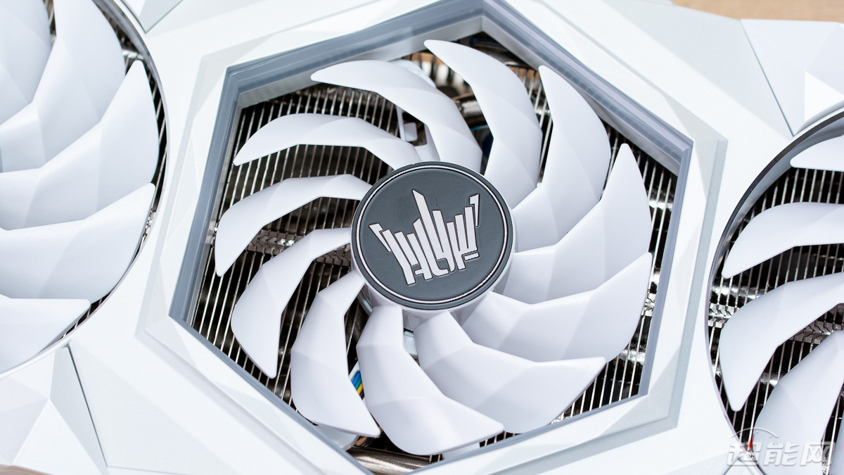 显卡所用的白色幻象散热器搭载有2个100mm和1个90mm直径的刀刃式风扇,支持智能启停功能,可在显卡低负载时自动停转风扇,将运转噪音控制在最低水平;同时风扇也支持Hyper Boost一键全速功能,虽然牺牲了噪音,但是可以为散热器带来最佳的散热效能,适合超频玩家使用。
