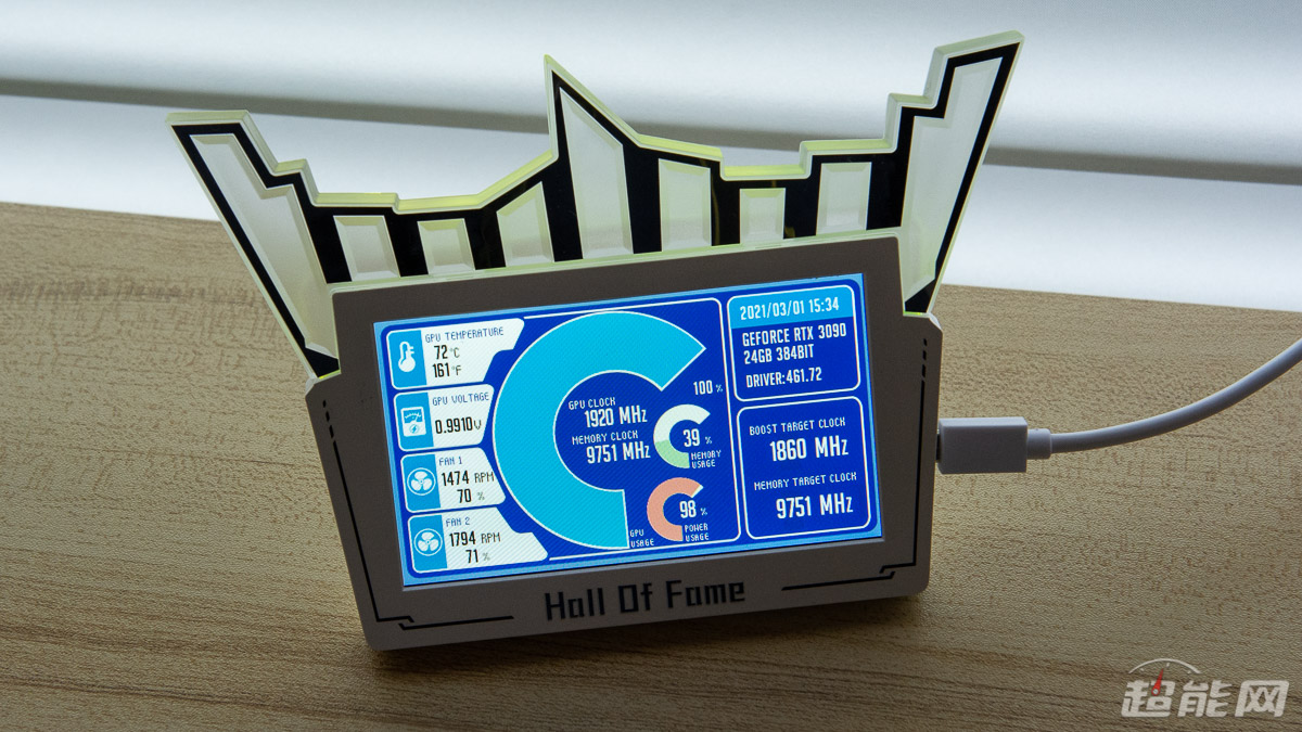 抛开这些显卡自身的性能表现,影驰RTX 3090 HOF Extreme限量版显卡标配的附件也非常有意思,其中HOF Panel III显示面板是颇具实用价值的,不仅可以作为数码相框或者视频播放器使用,更重要的是它可以监控显卡的工作状态,让玩家不需要借助其他软件就可以查看显卡的实时状态,从这个面板我们就可以看出影驰确实有为玩家的需求做出回应。