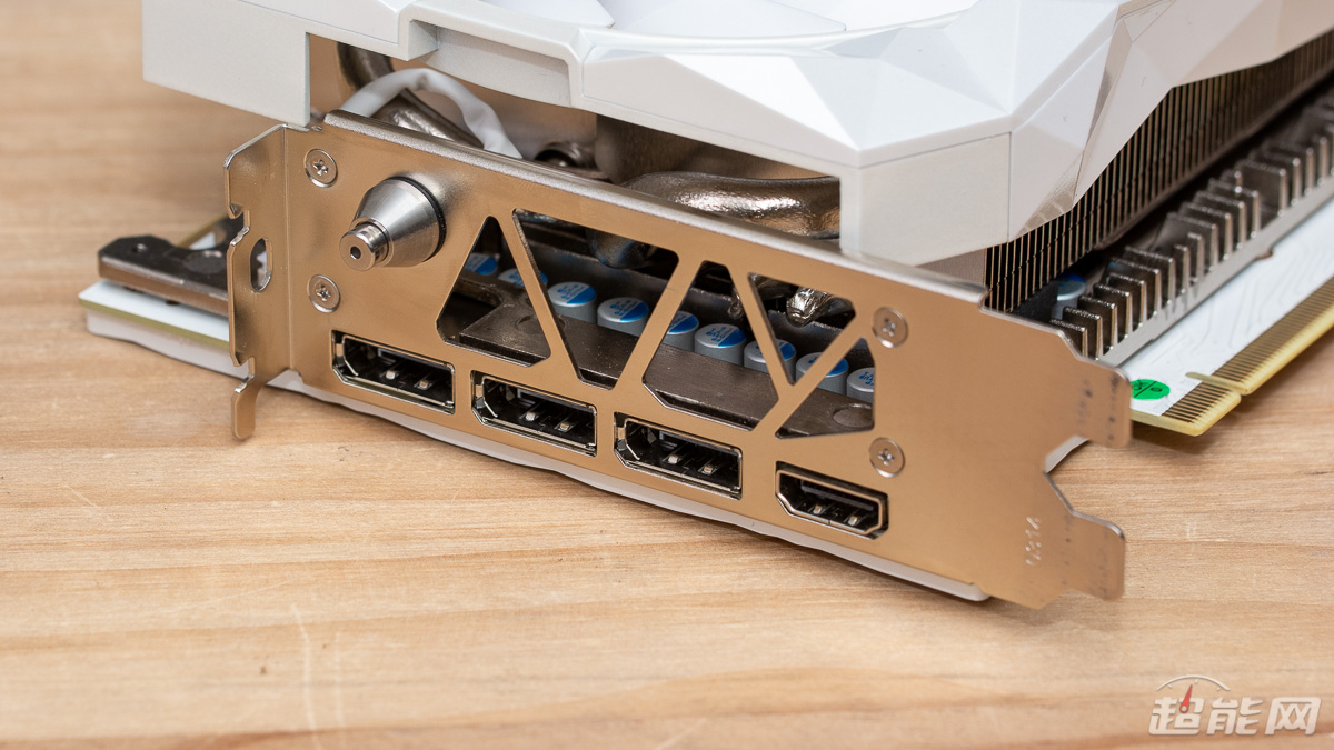 显卡的显示输出接口为3个DP1.4接口以及1个HDMI2.1接口,可满足多显示器用户的使用需求;位于显示输出接口上方的按钮则是显卡的Hyper Boost功能开关,按钮上有LED灯展示工作状态,开启后散热风扇将进入全速运转的状态,为显卡提供最佳的散热效能。