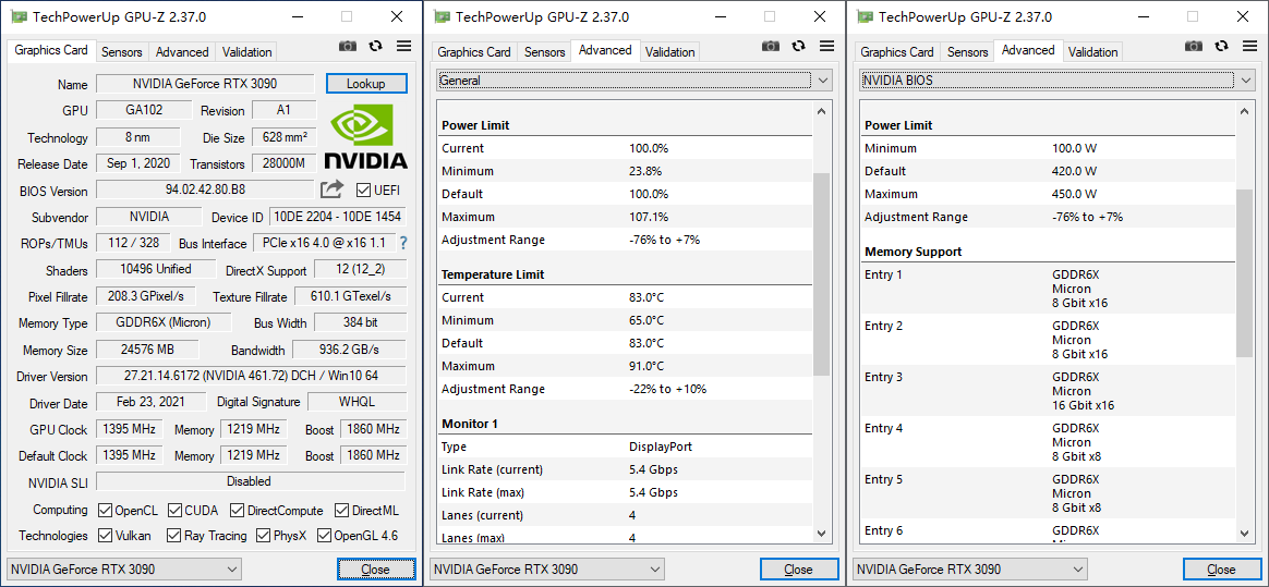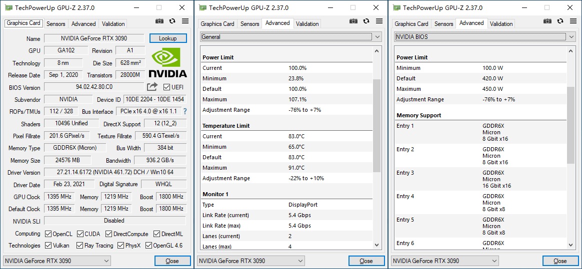 切换到S-Mode BIOS后显卡的基础核心频率同样是1395MHz,不过Boost核心频率会下调至1800MHz,显存规格仍然为数据频率为19.5Gbps、384-bit位宽、带宽936.2GB/s;其余设定与P-Mode BIOS基本维持一直,默认温度上限为83℃,最高可提升至91℃,TGP功耗上限默认为420W,最高可以提高至450W。