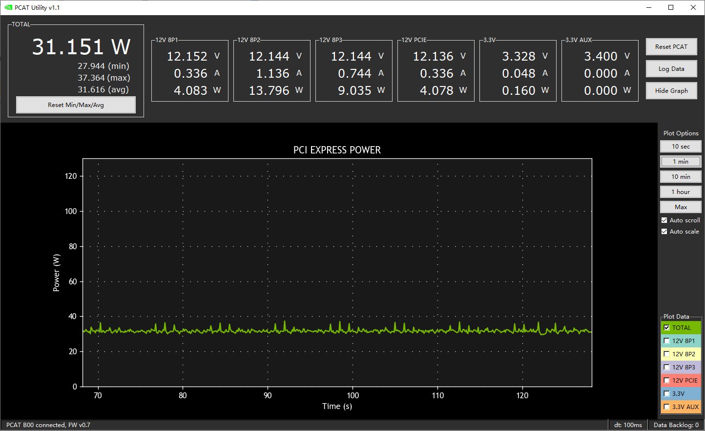 显卡功耗测试使用的是NVIDIA提供的PCAT工具,可以精确测量显卡PCI-E与外接电源接口的实际功率。显卡的待机功耗是在Windows桌面静置获取,满载功耗则在3DMark Time Spy Extreme压力测试中获得。