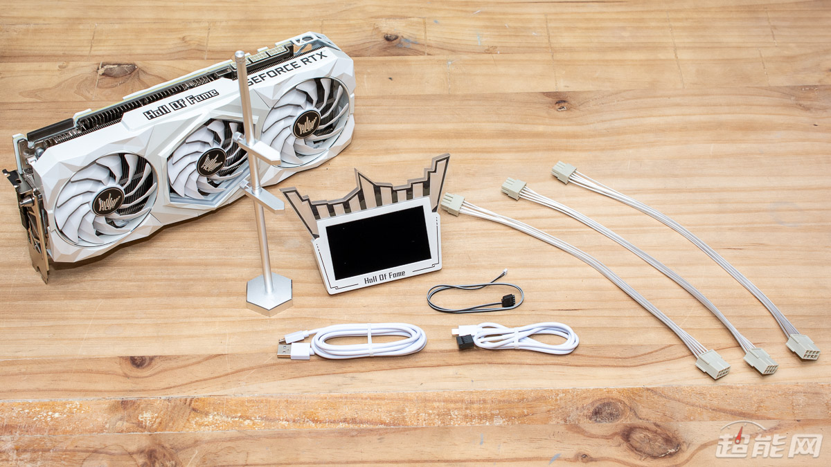 显卡所提供的附件非常丰富,不仅有三条白色接口的镀银供电延长线可供玩家装机使用,而且还配置有一个金属材质的显卡支架,用以支撑显卡略显庞大的身躯。当然最引人注意的附件是附带的HOF Panel III全彩显示屏,可以通过标配的USB数据线连接到主板上,实现数码相框或者显卡状态监视器的功能。