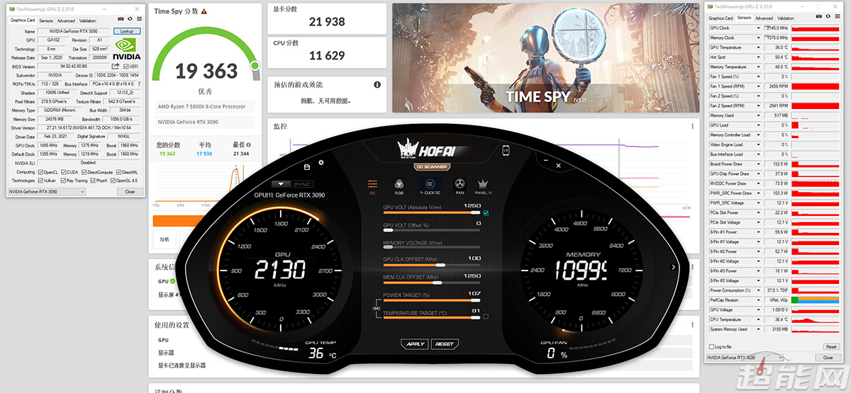 我们尝试了HOF AI Suite的一键超频、OC Scanner超频以及手动超频三个项目,从最终结果可以看到,一键超频和OC Scanner都只对GPU进行超频,前者默认是提升15MHz基础频率;OC Scanner则需要20分钟左右的自动运行时间,将GPU基础频率提升了78MHz;手动超频则是传统方法,最终我们将显卡的基础核心频率提升至1495MHz,实际Boost频率提升至最高2145MHz,显存数据频率提升至22Gbps的情况下通过了3DMark的各项测试。