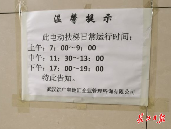 长江网3月1日讯(记者刘海锋)近日,市民张女士通过长江网武汉城市留言板反映,洪山广场地铁站B字头的多个出入口均存在电梯限时开放的问题,只在早中晚三个时段开放,市民在其他时段上下楼很不方便,希望对这一现象进行整改。