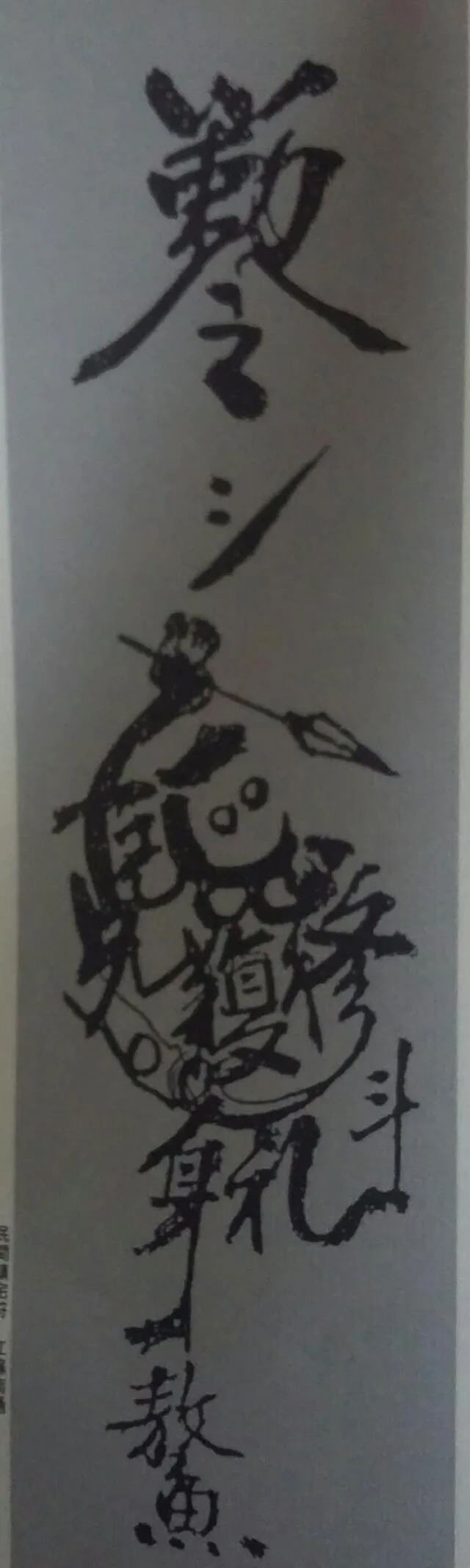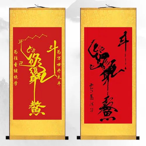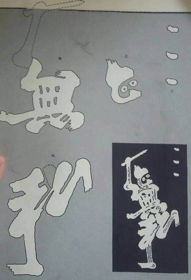 魁星点斗图,魁星手上的笔和手指是个“克”字,另一只拿砚台(或者墨斗)的手是个“己”字,中间腹部是简写的“复”字,双腿是简写的“礼”字,头发是个草书的“正”字,胡子和嘴巴部份,则是个草书写法的“心”字,胸部和肋骨是个“修”字,左边大腿和小腿是个长长的“身”字。