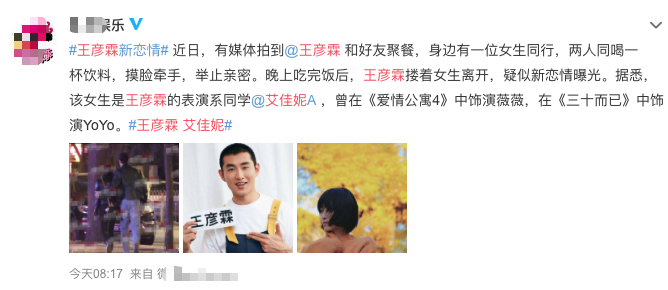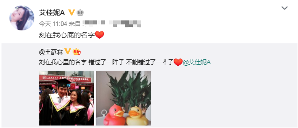 3月2日早上,王彦霖突然在个人的社交平台上发文官宣了恋情:「刻在我心里的名字 错过了一阵子 不能错过了一辈子」,不仅配上了一颗爱心的表情,而且也还艾特了女方艾佳妮。很快艾佳妮也转发:「刻在我心底的名字」,同样配上了一颗爱心,一时间也得到了许多网友的祝福。
