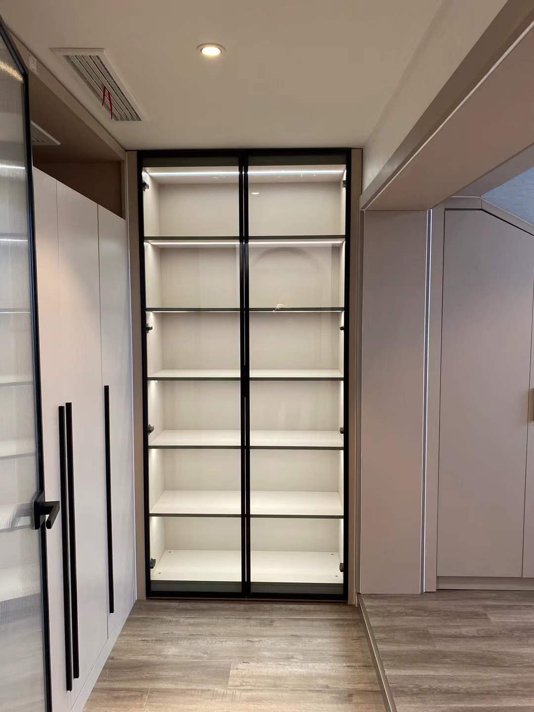 玄关旁边做了鞋柜,也挡住了旁边的楼梯。电视背景墙旁边做的收纳柜是带玻璃门的,这样就不怕落灰了,也遮挡了视线,不会“看到”收纳空间。
