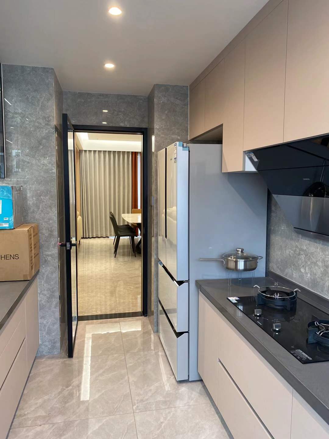 餐厅的对面是厨房,厨房用的是砖夹橱柜,冰箱也放在厨房。