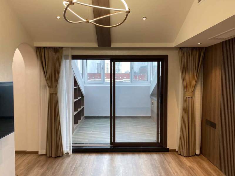 跃层顶部是不规则的,所以就用了拱形门洞来“缓一缓”。创意吊顶搭配金属色,北欧风格的吊灯,别具一格的效果。