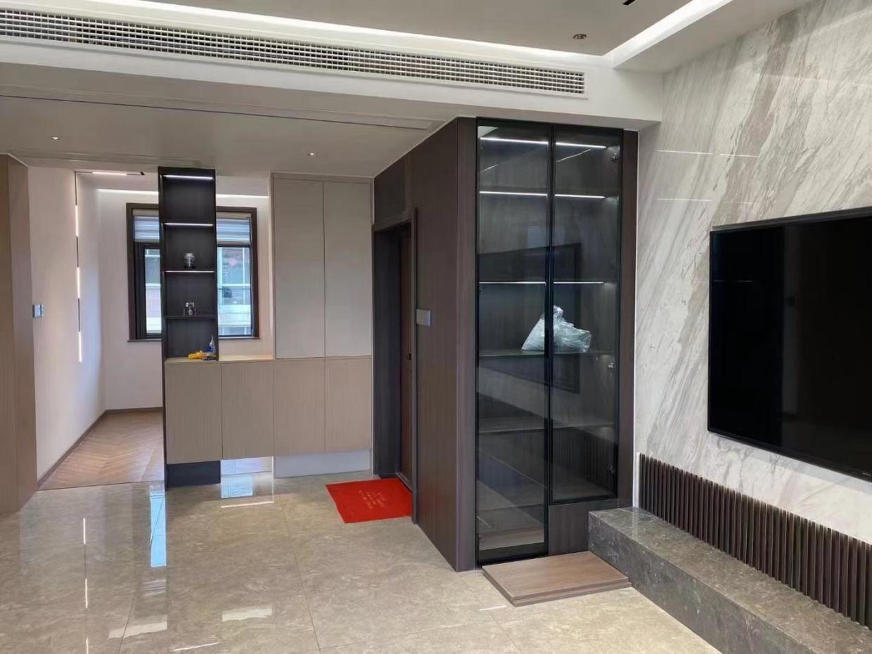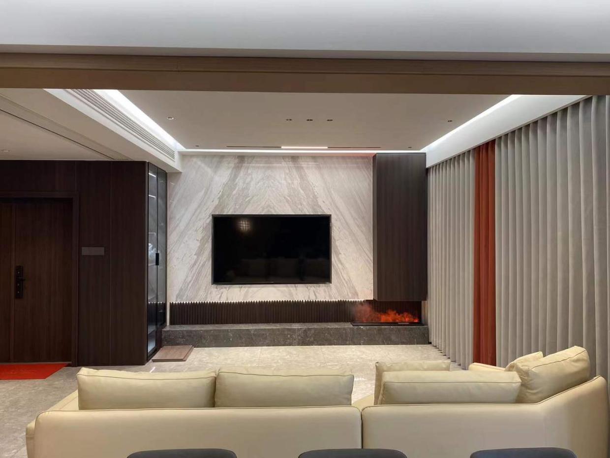 客厅用的是线性灯,也是现在比较流行的。客厅旁边还做了收纳空间,玄关的颜色和收纳柜一样,完全成为一体了。电视背景墙是用石材做的,高端大气的效果很好。