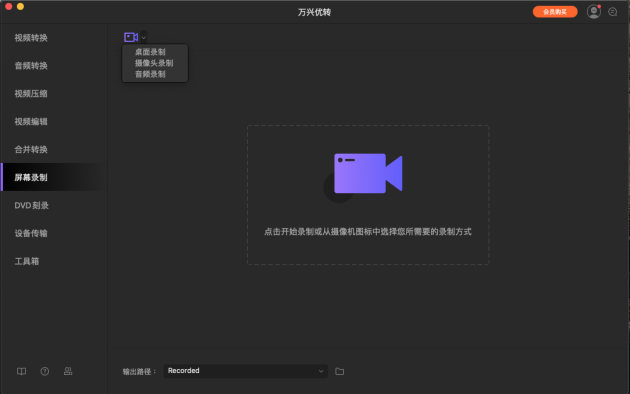 在你的Mac电脑上安装后,启动万兴优转。在主界面上,选择视频录制功能,然后点击图片选择录制方式。