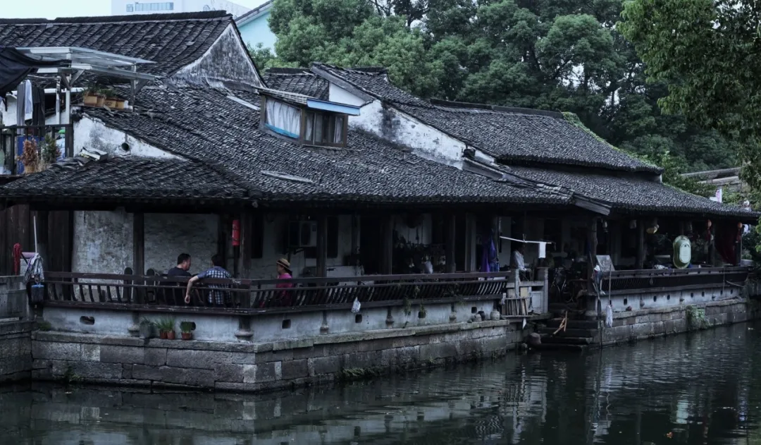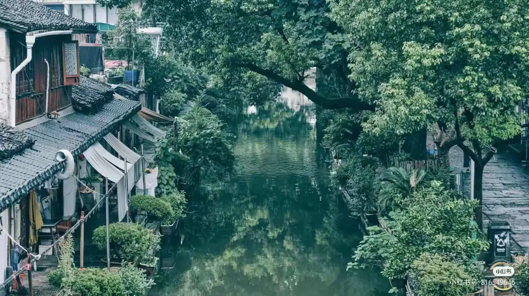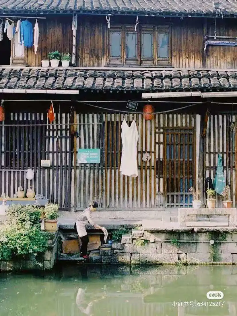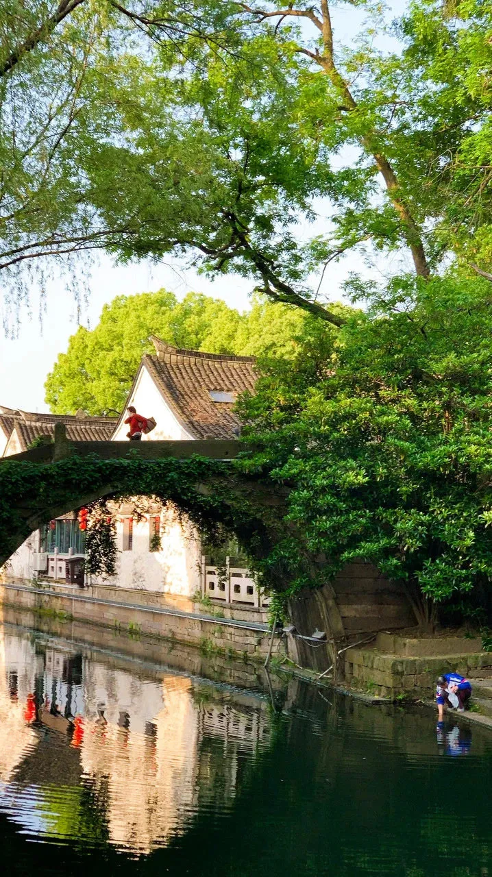 除了动人的家常味儿之外,这里的风景也依然动人。桥两侧和岸边都爬满了不知名的植物,青石板的缝隙里生出的浅薄青苔上还烙印着岁月的模样,家家户户的门前也有人摆着绿植、种了葱蒜,真正是梦里向往的水乡模样。