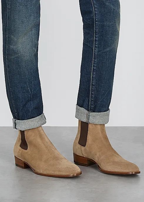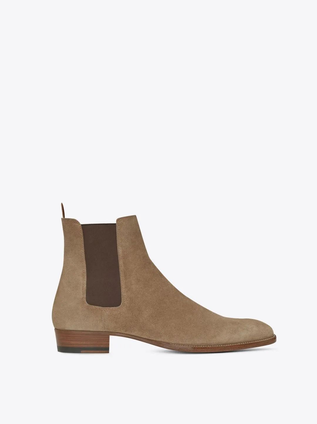 日常偏商务休闲风格、喜欢复古麂皮材质的男士,可以试试 Saint Laurent 的 Wyatt 切尔西靴。这款靴子鞋型偏修长,上脚显得年轻有型。