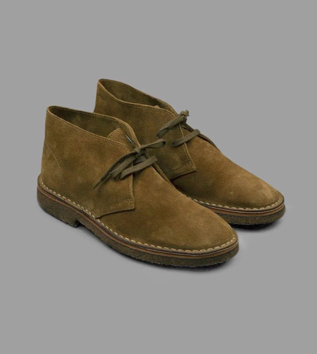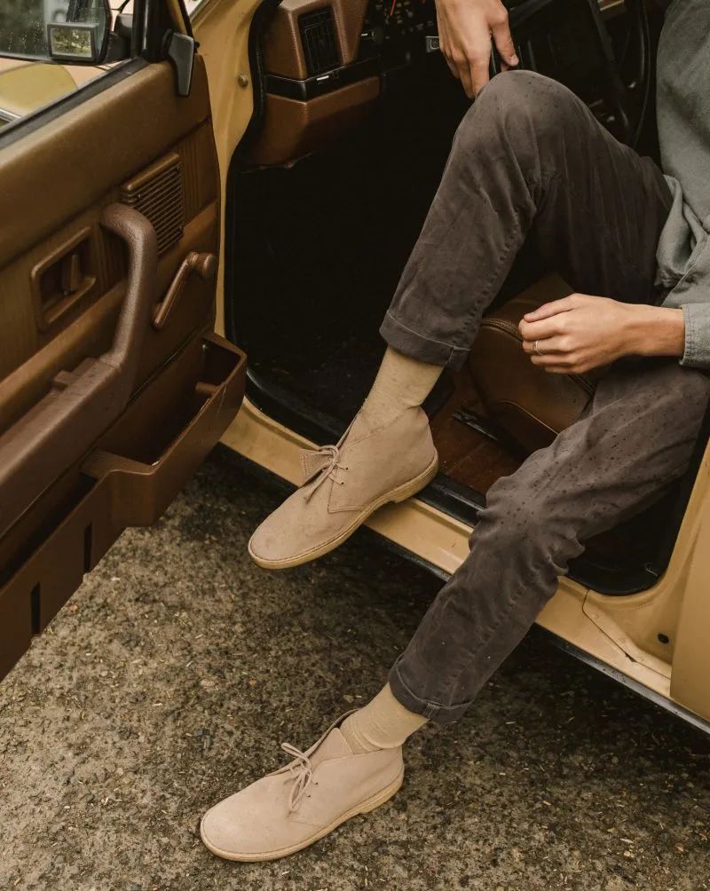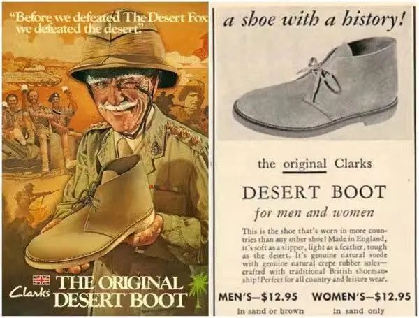 顾名思义,沙漠靴起源于沙漠,在二战期间,英国驻北非战场上,又高又笨重的普通军靴并不能适应环境,所以军方从埃及定制了一批高度及踝,麂皮鞋面、生胶鞋底的新款战靴。