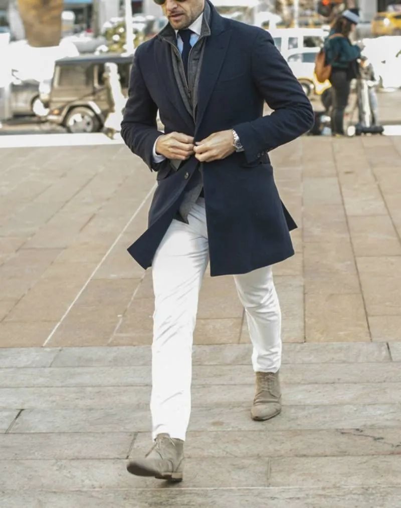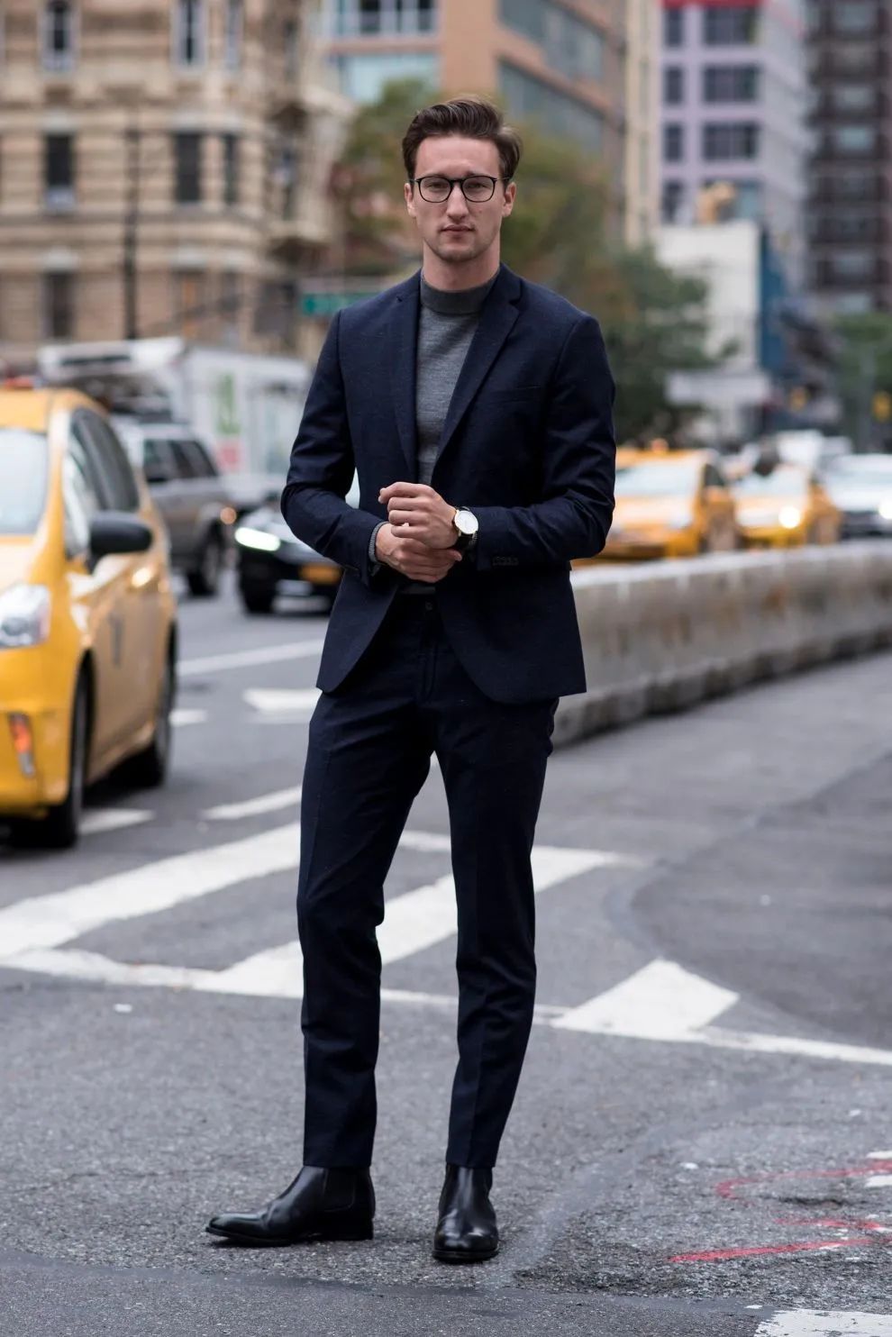 除了搭配全套正装外,切尔西靴还很适合商务休闲风。在着装要求没那么严谨的场合,穿休闲款西装搭配牛仔裤或是休闲裤,加上一双切尔西靴就能让造型显得轻松又不失质感。