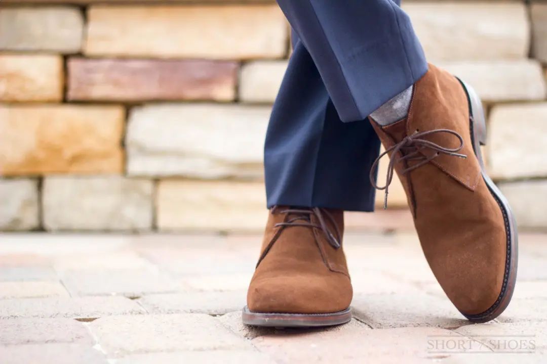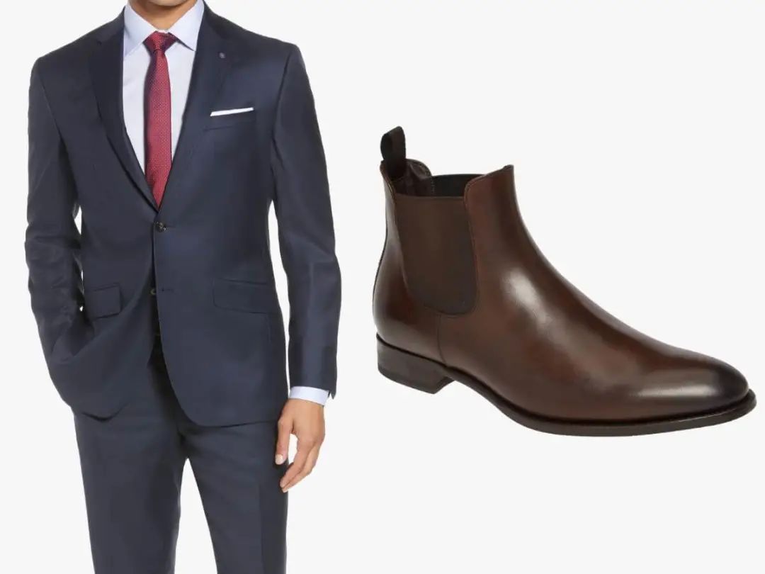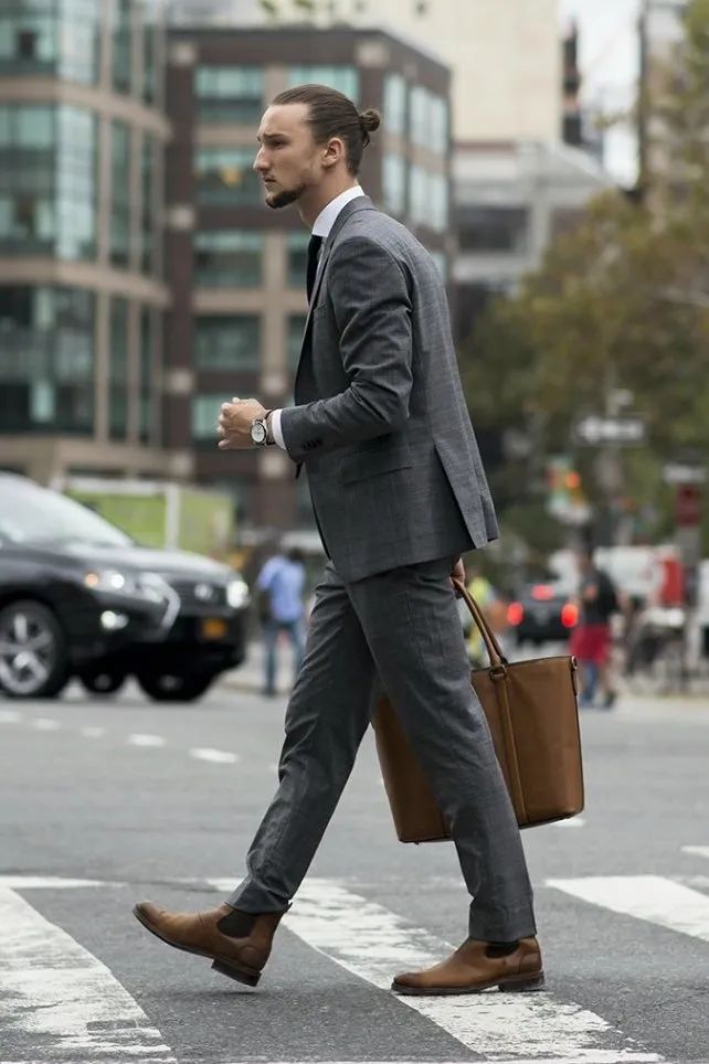 棕色光面皮革或是麂皮材质的切尔西靴有种复古感,更适合用来搭配浅色西装,或者搭配比较偏复古风的粗花呢三件套。
