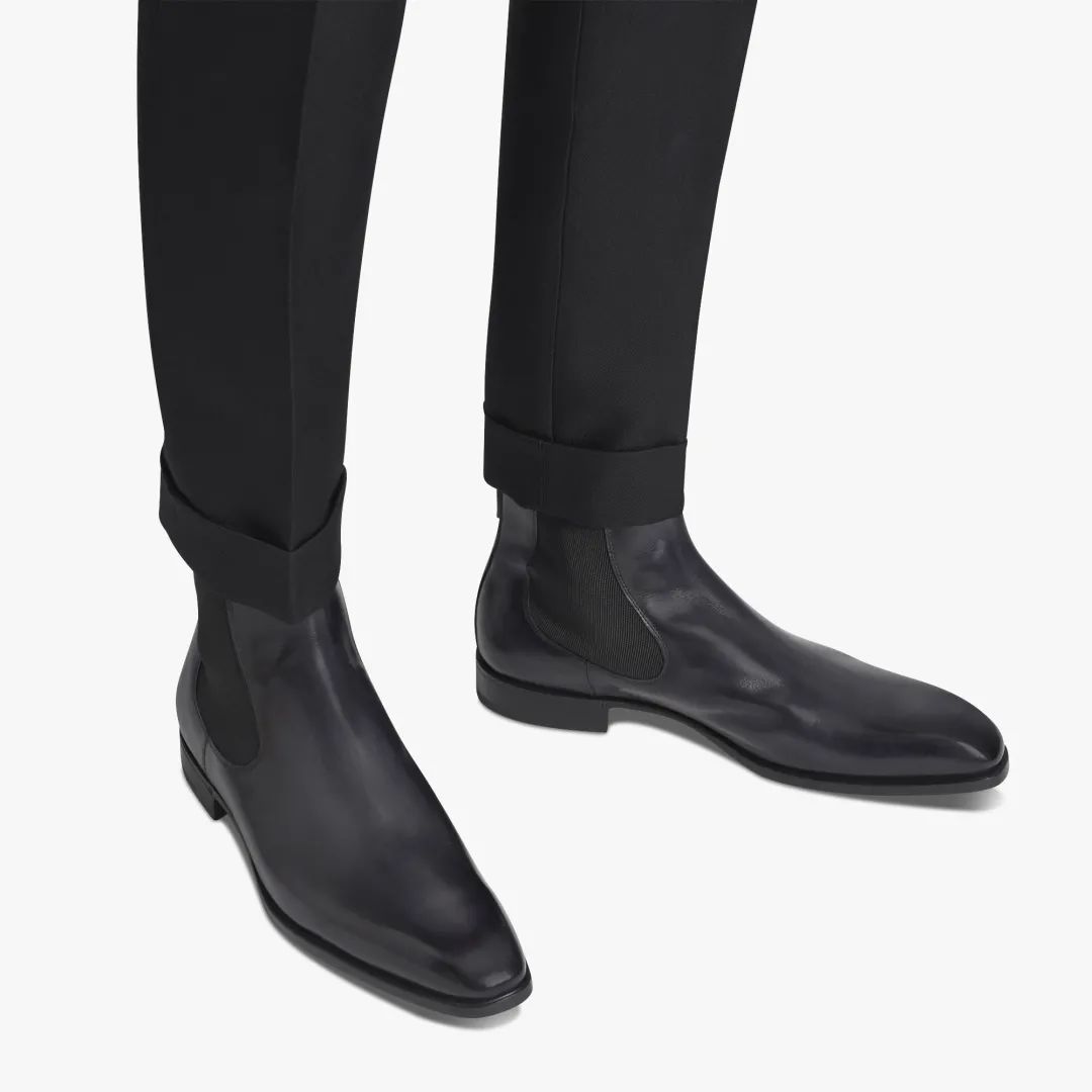 想要穿出正统绅士的感觉,可以选择光面皮革的材质。尤其是黑色光面皮革的基础款切尔西靴,和深色西服套装搭配在一起成熟稳重。