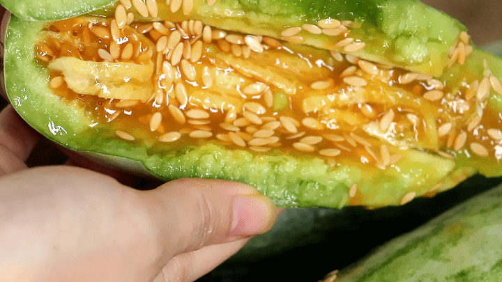 “咔嚓”一声切开,砧板和刀面上都沾满了汁水,满盈盈的甜蜜果浆在瓜里晃动。终于知道为什么它这么被大家热捧了。