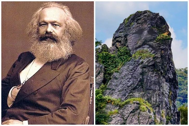 目光游移间,忽然心下一动,右边最高一处突起岩石极其眼熟,我凝神细看,一个名字脱口而出:马克思,马克思的头像,太像了!只见“他”仰头傲视苍穹,颔下标志性的浓密胡须微张,那蜷曲厚实的头发,高耸的大鼻子,欧洲人的典型高颧骨,还有微陷的眼窝,仿佛可见睿智深刻的眼神,闪烁着哲思的火花,充满奥秘和智慧。我想起1990年受单位委派,去英国莱斯特大学任高级访问学者、荣誉研究员。到达英国的第一天,我即去伦敦北部海格特公墓祭拜。那里耸立在马克思墓碑上的头像雕刻给我留下了极深的印象,那宽额头、聪慧眼、大胡子,栩栩如生出现在我的面前!我瞻仰过的头像与眼前的岩石相似度达到百分之八十,那熟悉的轮廓在青山掩映中浮现,不禁心中激荡。今年是马克思诞辰两百年,全国各地都发起了各种纪念马克思的活动,只是他毕竟从未涉足中国,无处可有实物寄托。在武宁山中发现了这一处马克思景观石,可供人们前来观赏瞻望,寄托崇敬仰慕之情,可谓正当其时。这块岩石的行成早在亿万年前,历经地壳断裂升降,水的溶蚀,风的雕刻,才完成这一番杰作。这一发现让我的心情明朗起来,再看这一片崇山峻岭,多了几许飞扬的思绪。武宁的山文化确实还没有定型,但这也意味着还有无限可能,这也许就是吸引我一而再再而三到武宁来的根本原因。