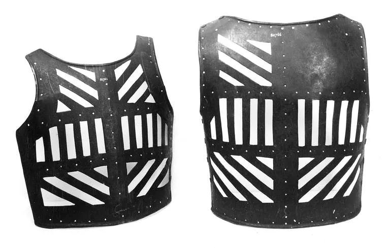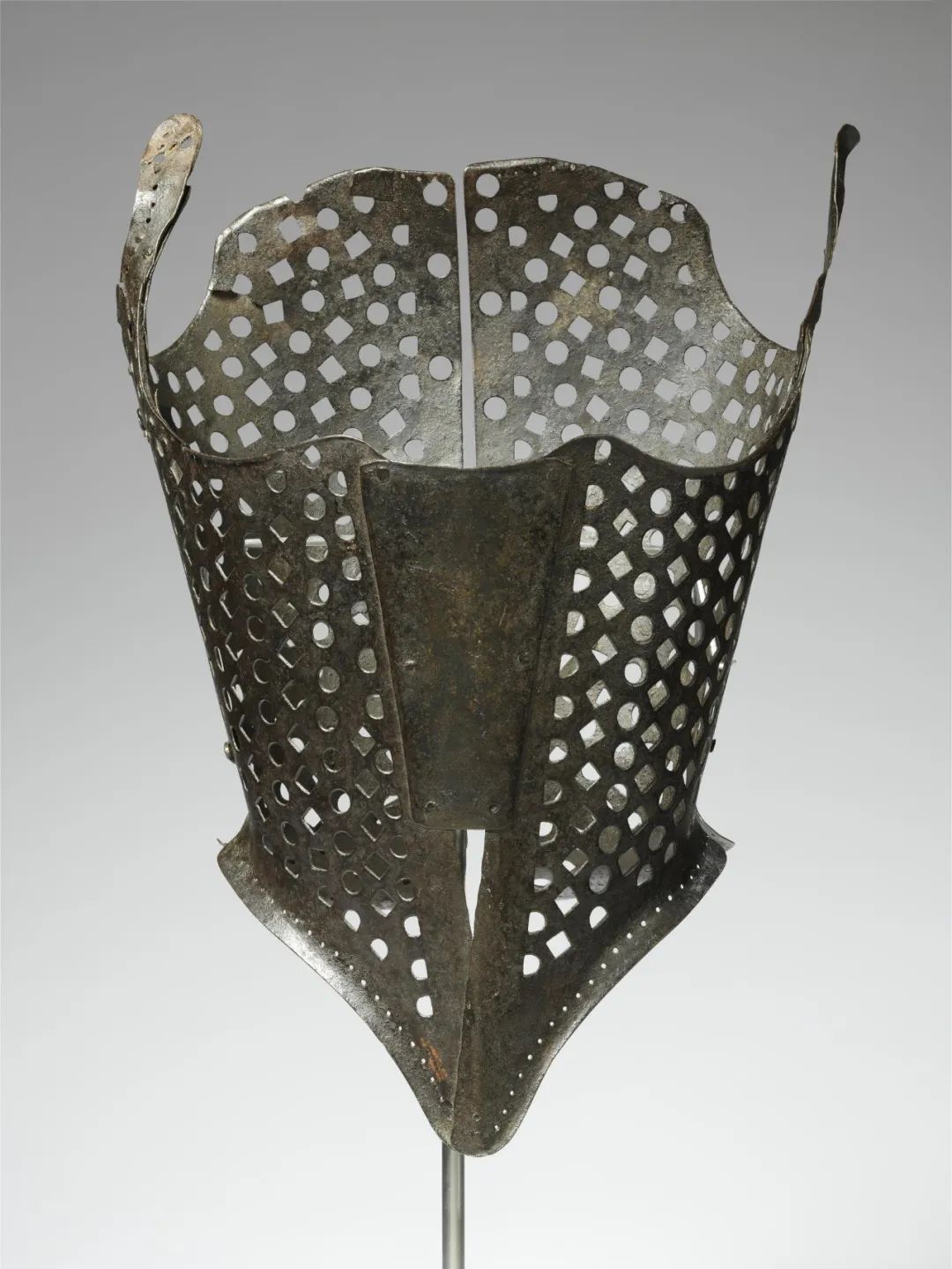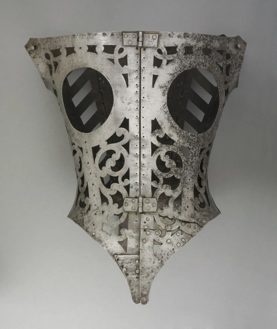 这件藏于惠康收藏馆的铁制束身衣由镂空的铁、皮革肩带和铰链组成,专为身材瘦削的成年人或青少年男性设计,其制作年代或可追溯到15至17世纪。肩带和前锁上的凹槽可以让佩戴者按需调整。这类铁制束身衣一般只有2斤左右,所有穿孔和装饰性的镂空都是为了减轻重量。