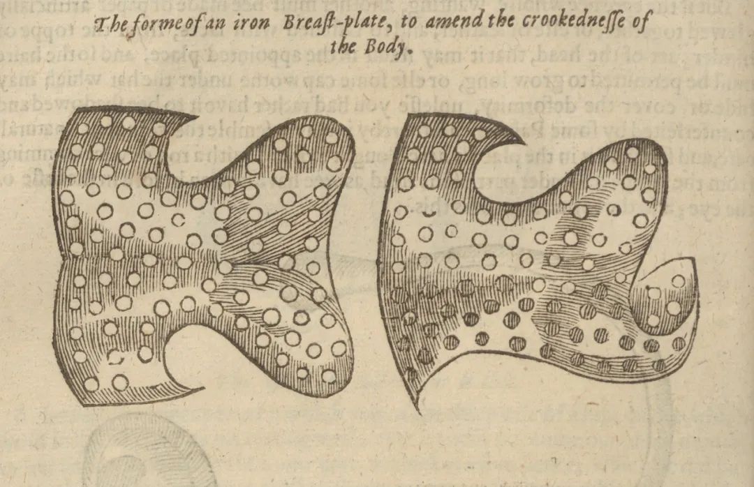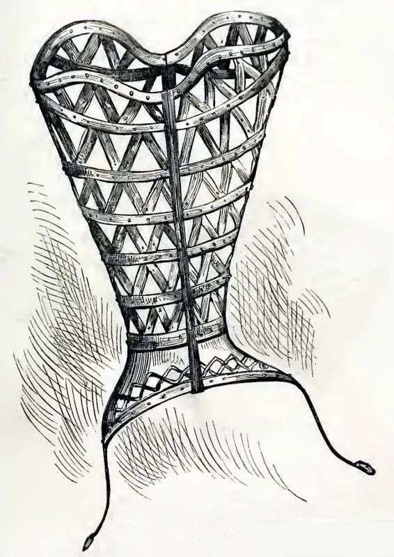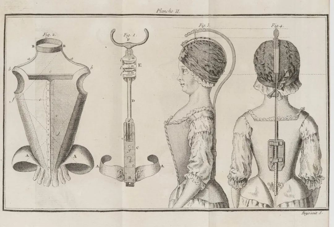 这种束身衣“有很多小孔,这样穿起来就可以更加轻便;为了不伤及身体,其内里还衬有填充物”。他认为少女的脊柱比少男更容易变形,倘若她们年幼时就学习行屈膝礼、缝纫或写字,那么畸形程度就会更甚。因此,大多数藏于博物馆的铁制束身衣都是为女性定做的。