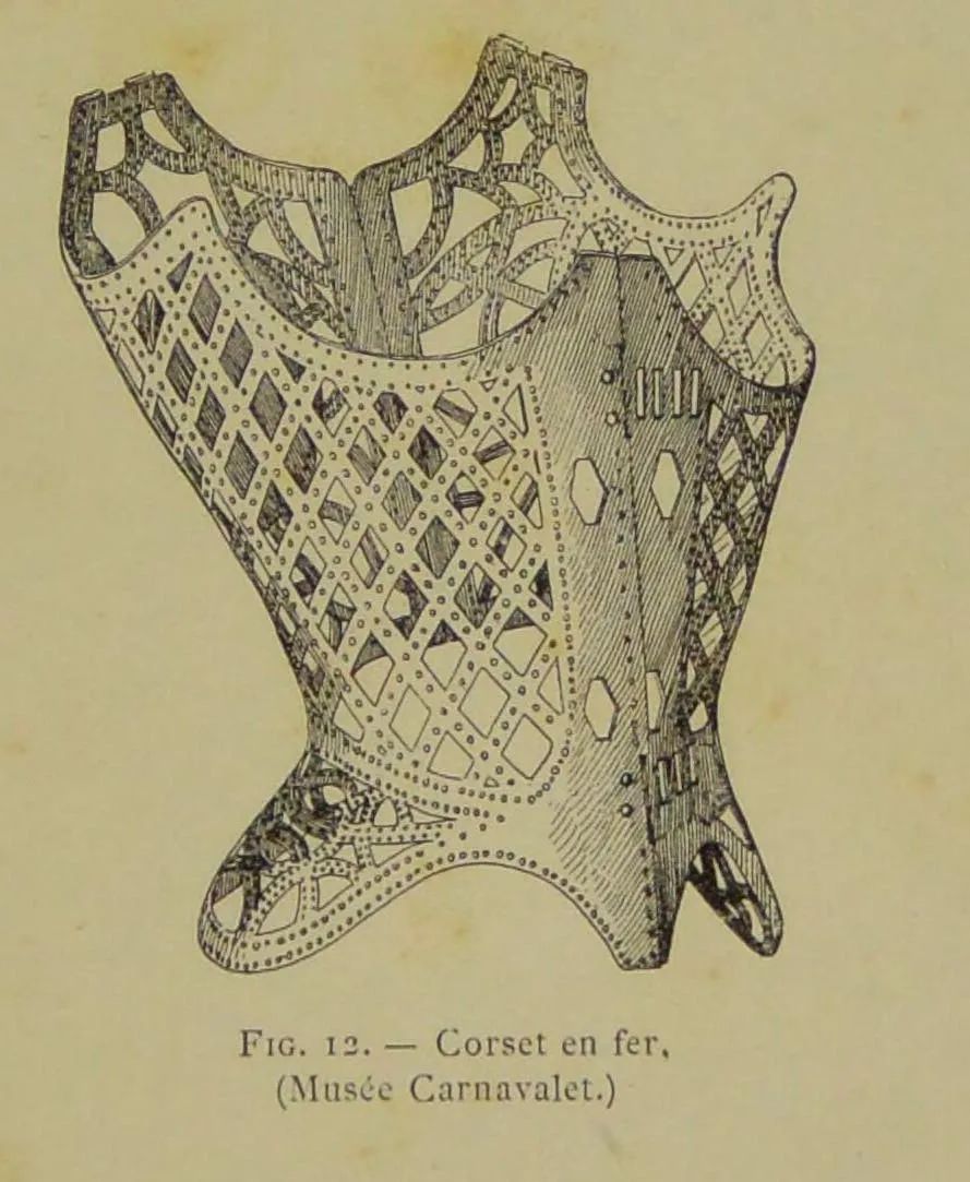 19世纪的法国历史学家欧内斯特·莱蒂(Ernest Léoty)在《束身衣史》中写道:铁制束身衣穿在普通紧身胸衣之外,并被覆盖上了一层厚布(可能是天鹅绒)。这两种束身衣对身体施加了双重束缚。仔细研究博物馆收藏的铁制束身衣后,我们发现边缘锋利处留有丝绒的痕迹。我们没找到有人身穿铁制束身衣的照片,这可能是因为它们只被穿在外衣内,以支撑和塑造身形。