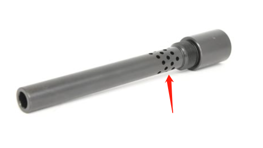 但如果这弹并不是亚音速呢?比方说9mm手枪弹的初速一般在350米/秒左右,它要想进入亚音速要不就是增重弹头,减少装药。要不就是用特种枪械发射,比方MP5SD的枪管后端有一堆泄压孔,当发射药刚推着弹头前进,火药燃气就早泄了,这样也能起到降低初速的作用。