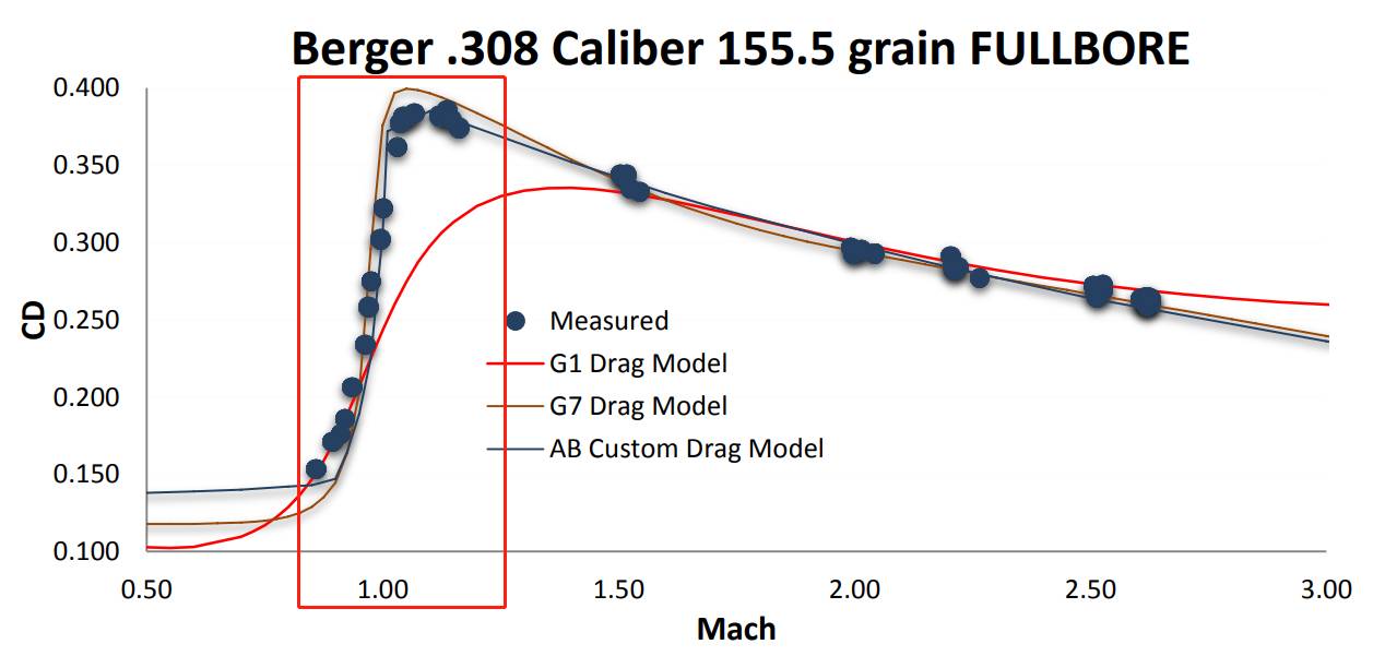 红框区域大约是0.8马赫到1.3马赫,这是个跨音速区间,而在这个范围内阻力变动的非常大,气流和涡旋也会让弹道变得非常不稳定,简单来说就是但凡子弹通过这个跨音速区,那准头就没得看。(一些高精狙也一样,但凡子弹速度衰减到跨音速区,那么精度就会渣的一塌糊涂,所以他们的子弹都特别强调抗风阻,好让子弹尽可能的在超音速区多飞一会儿)