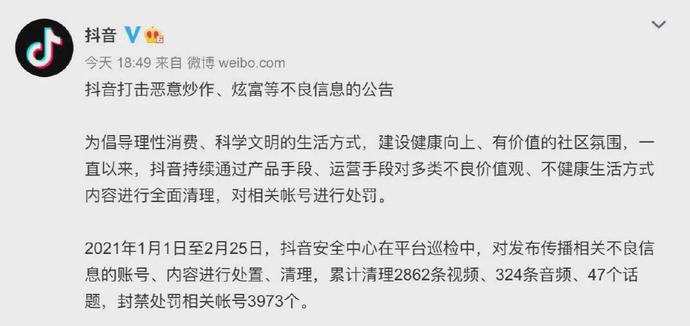 昨天抖音官方宣布将对三千多个账号进行封禁。