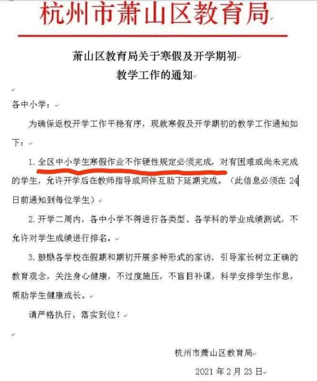 日前,浙江杭州萧山区教育局发布通知:全区中小学生寒假作业不作硬性规定必须完成,对有困难或尚未完成的学生,允许开学后在教师指导或同伴互助下延期延期完成。