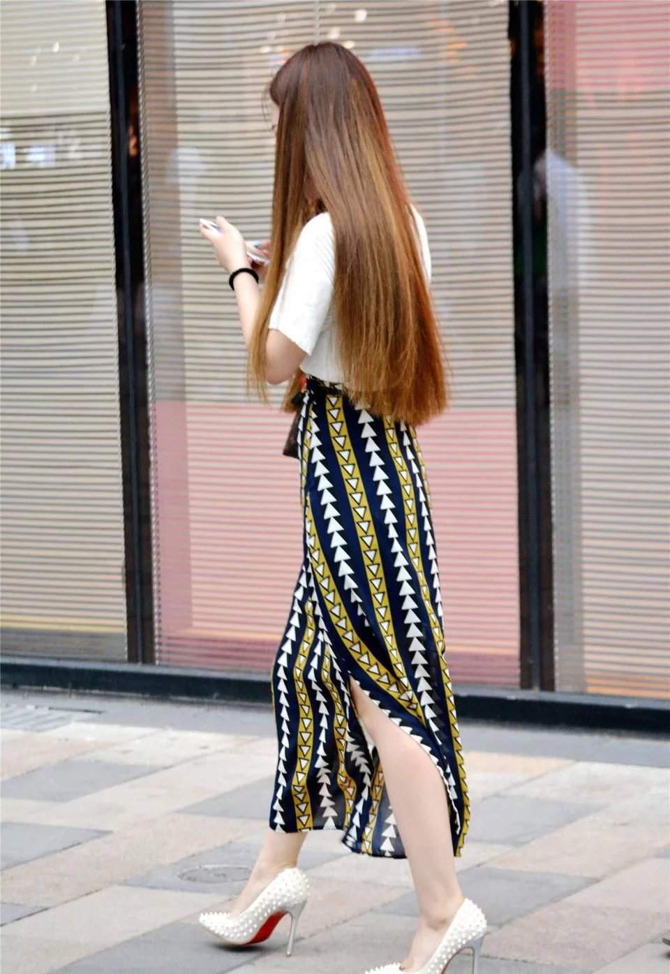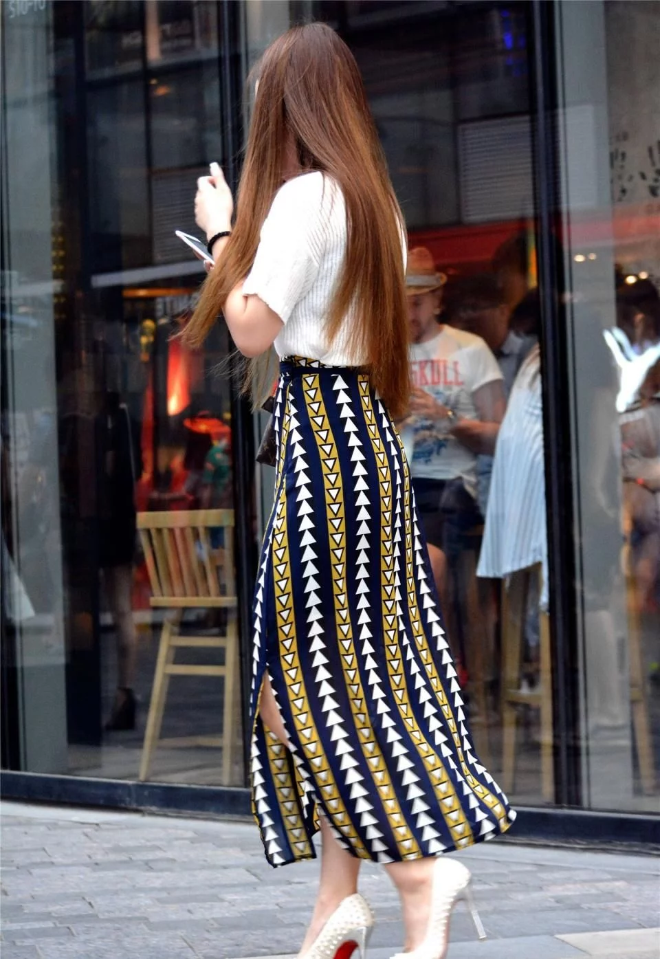 选择一款拼接色半身长裙,黑色和暗金色组合在一起,上面布满了白色三角,非常好看,高腰的款式,会显得身材比例很好,侧面的开叉,走路会更加轻松,裙摆到脚踝的位置,让搭配显得很简约,一件白色半袖,这样就穿出很精致的感觉,时尚的姑娘就是会搭配自己,她们知道如何搭配会更加好看。