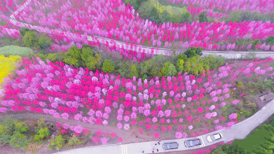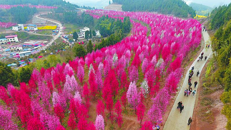 三月桃花笛歌婉,一夜酥雨花语嫣,诗韵清扬芳凝穹,半枕幽香半酣眠!每到阳春三月,一场沥沥春雨过后,中江县红泉村的桃花谷便迎来了满谷的姹紫嫣红,1800亩观赏桃花竞相怒放,烟烟霞霞,灼灼芳华。