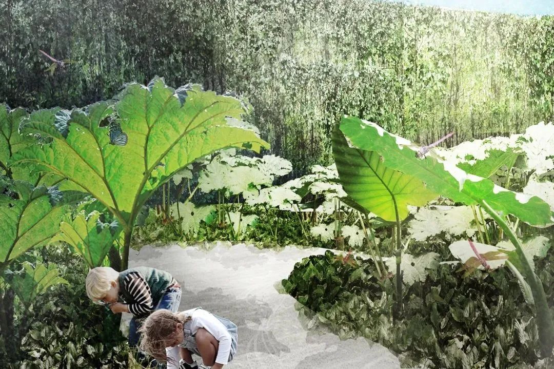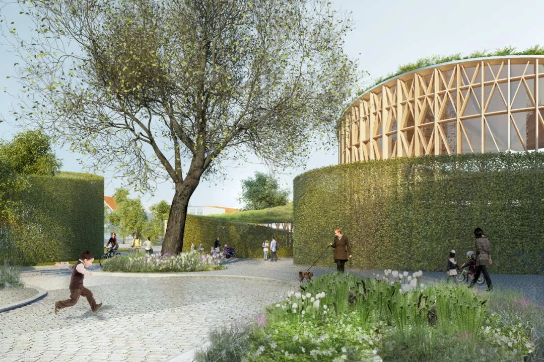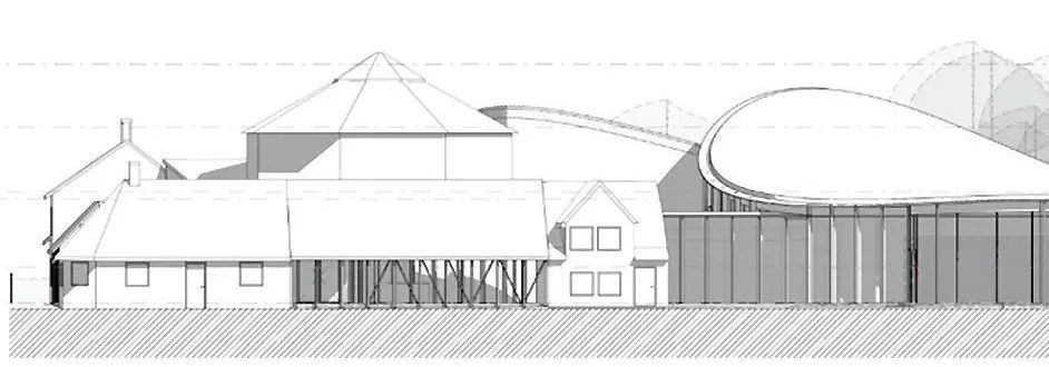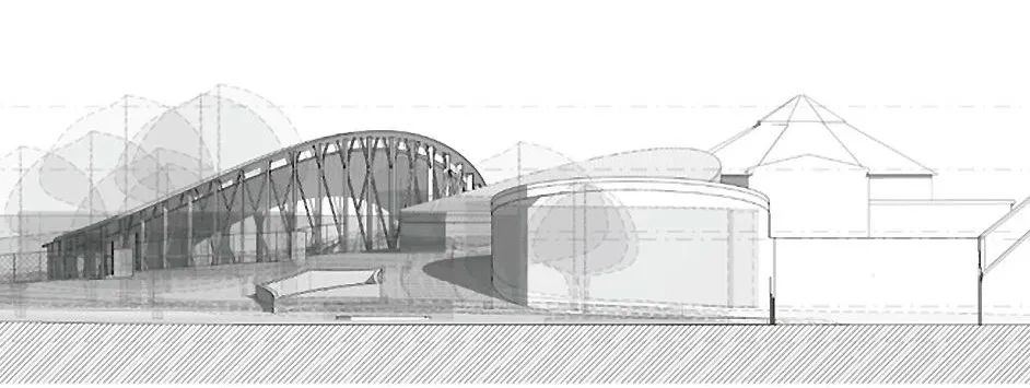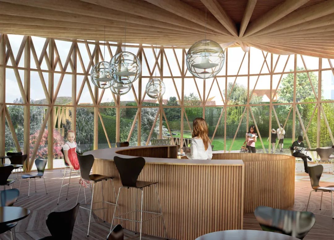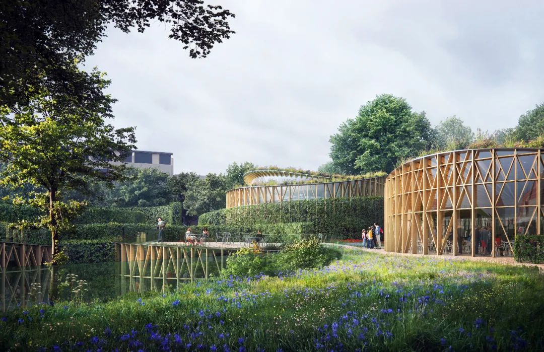 △ 新馆占地面积共计9000m2,建筑外观为弧线形,主要立面材料为钢材和木材,有2/3的建筑位于地下,屋顶覆盖郁郁葱葱的植物,与地面的乔木、树篱、灌丛形成有趣的魔法花园,以带有奇幻色彩的景观序列展开。